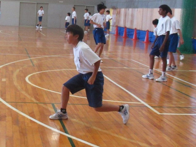 空調機器設置工事が進む体育館です。「体にひねりを加えながら、足を踏む込む。」まっすぐ、遠くへ投げる練習後は、シュートの練習へ。ちなみに指導する体育教師は、インターカレッジ全国2位の実力の持ち主です。本格的なプレーを身に付けていってくださいね。