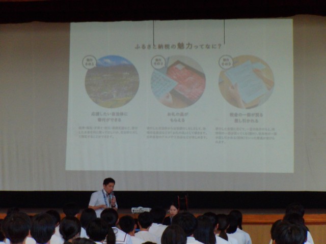 本日1年生は、総合的な学習で学ぶ、ふるさと納税について市役所の方からお話をききました。