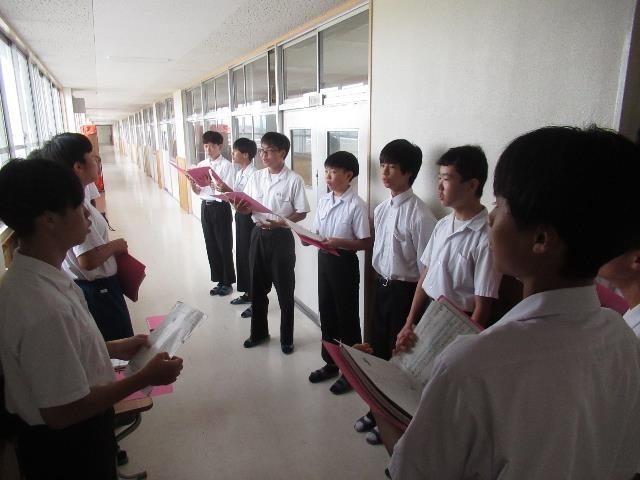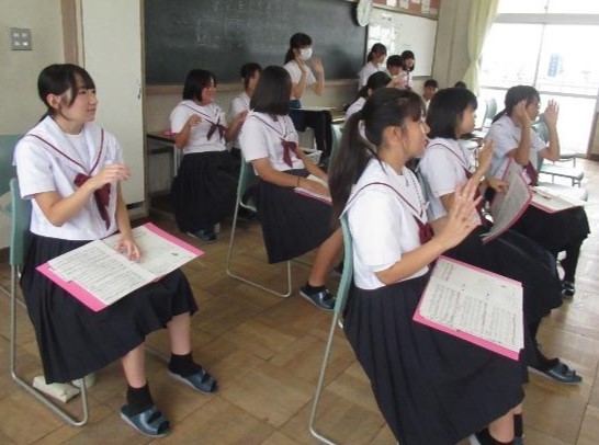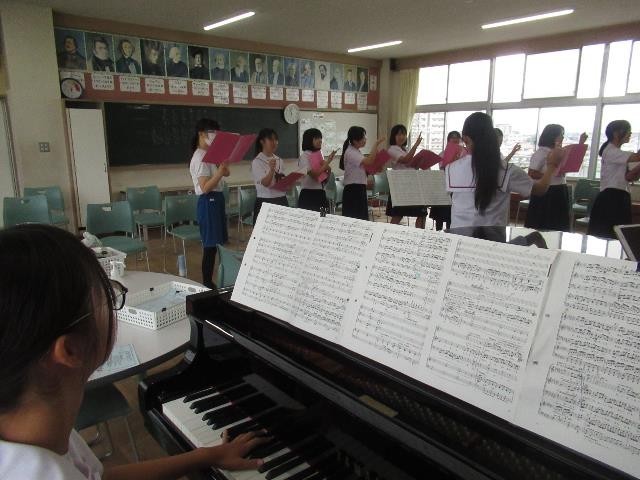 迫力ある男性パートが階段を伝わって響いてきます。音楽室では、ソプラノパートが入り方や伸ばし方を体全体を使って身につけようとしています。表現力を高め、自分たちの合唱へ創り上げる日々です。