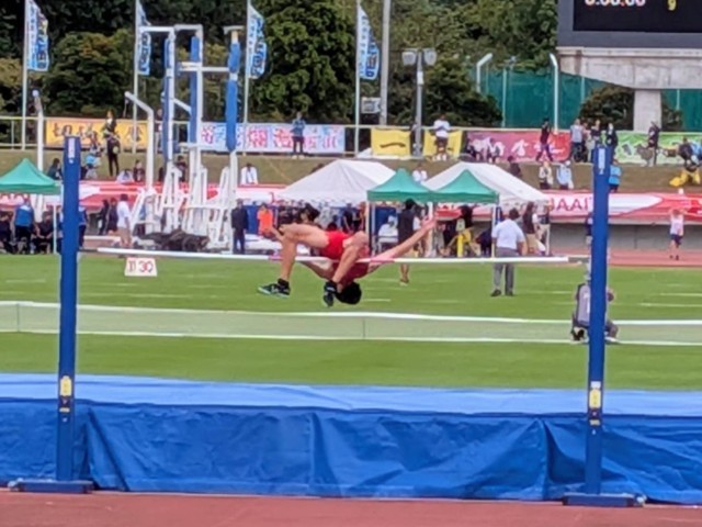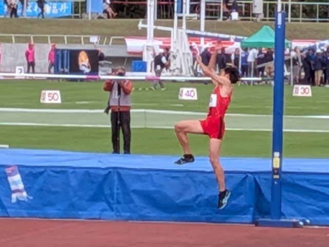 昨日の女子走高跳に引き続き、今日は男子走高跳に2年生が出場。競技は自分の身長より高い183cmからのスタート。2本目をクリアし、バーの高さは一気に190cmへ。跳べば、自己ベスト(189cm)更新となる大一番。後少しで…。