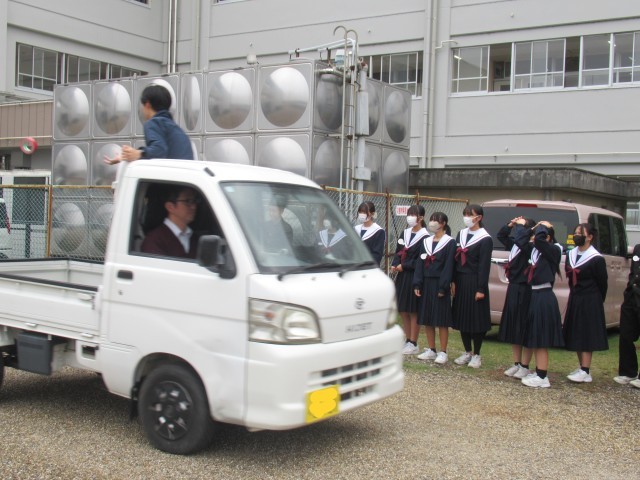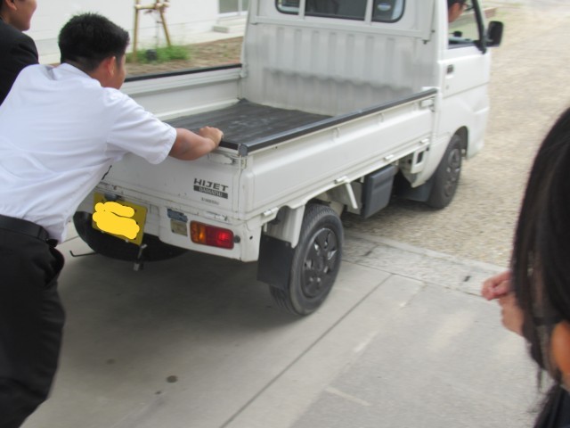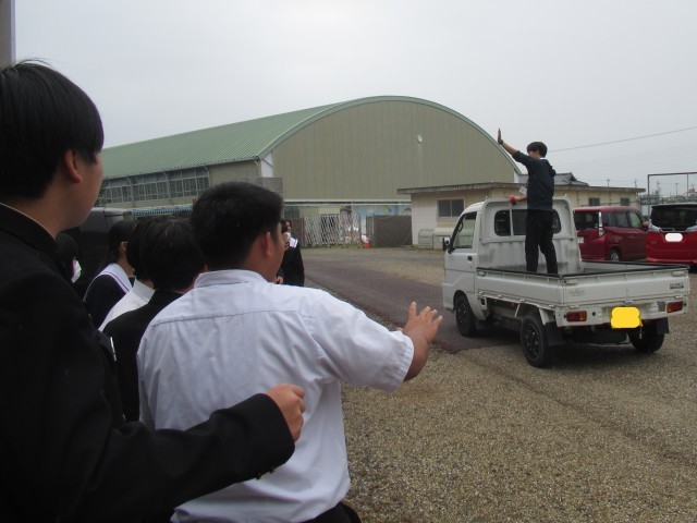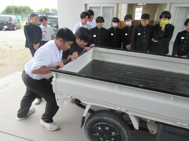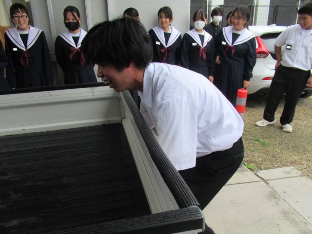 「動いている物体から、物を落とすと…」「摩擦力より大きい力が働くと…」このような現象を体感しようと大実験を行っていました。狭い教室を離れて、実験するのもおもしろいですね。いつか、軽トラックと勝負したことで盛り上がるといいな。