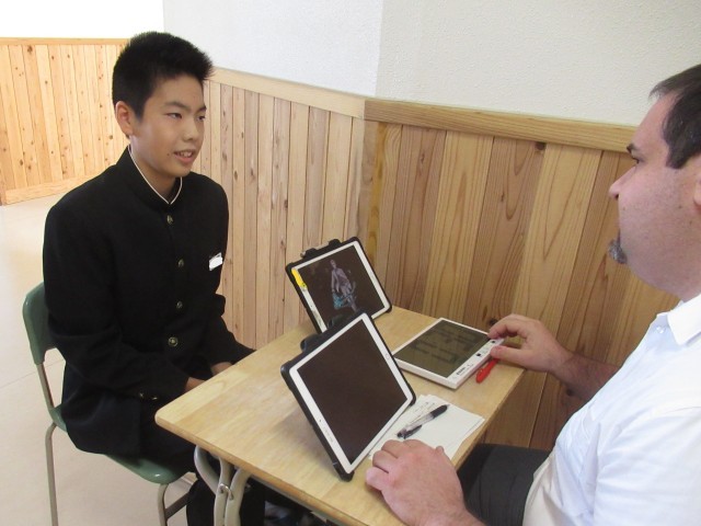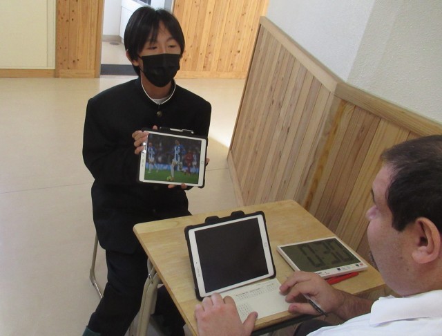 ALTの先生に向け、自分の好きな人物等を紹介しています。伝えるときの表情や話しぶりも見てもらっています。写真には撮れませんでしたが、パンチを繰り出して熱弁している姿もありました。ナイス、パフォーマンスです!