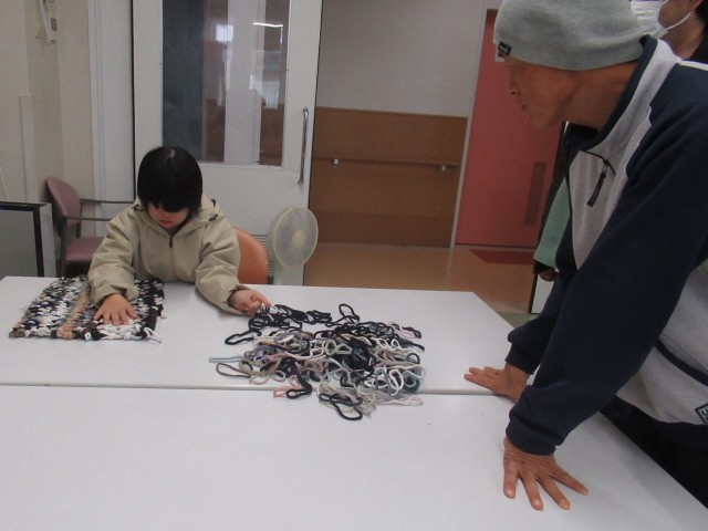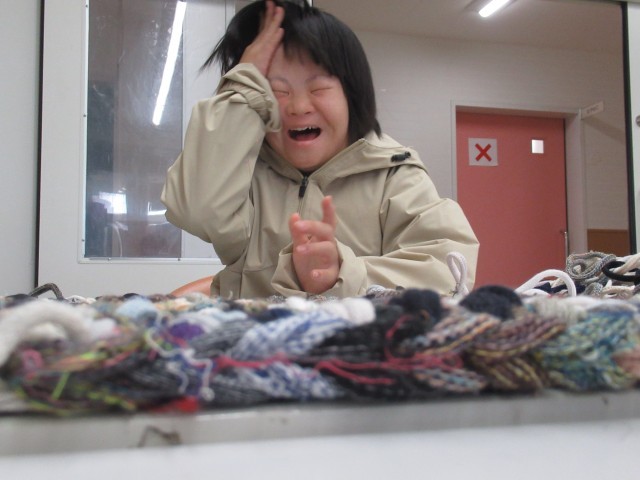 25日(火)から始まる2年生職場体験学習ですが、先陣を切って、昨日から2日間体験に出向いている生徒への陣中見舞いに出かけました。手編みのマットを解いて、編み直す作業に取り組んでいました。製品として販売するマット製作の練習になります。作業開始から約一時間半経っていましたが、すごい集中力で作業に取り組んでいました。施設長さんもとても感心していられました。いつもの投げキッスにめろめろになりましたよ。お疲れ様。