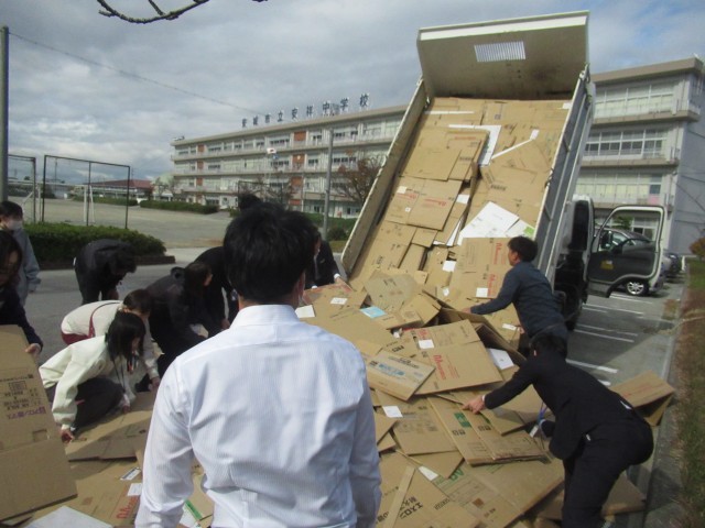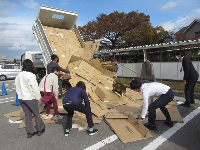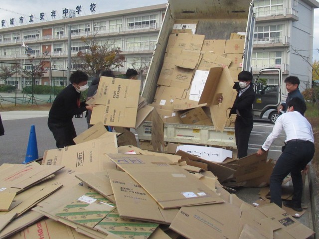 「先生、倉庫いっぱいに段ボール箱たまったから、持っていくわ。」と市内で「有限会社鈴木水道」を営む教え子からのうれしい連絡があったのは、先週末のことでした。4トントラックに満載の段ボール箱が、午前中に持ち込まれました。午後からもう1台分持ち込んでくれることになっています。明日から始まる「PTA持ち寄り資源回収」の景気づけになりました。ありがとうごさいます。12月19日(金)正午まで資源回収は行いますので、ご協力をよろしくお願いいたします。