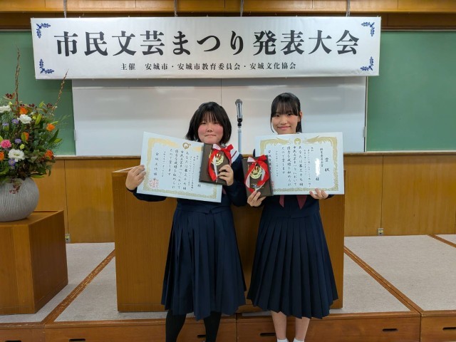 本日「第37回市民文芸まつり発表大会」が市民会館にて開催され、短歌の部(1,951首応募)において、2年生2名がそれぞれ「安城市教育委員会賞」と「安城文化協会賞」を受賞しました。中学生らしい瑞々しい感性にあふれたステキな31音です。その他、俳句の部8名 短歌の部9名が入選しました。おめでとうございます。