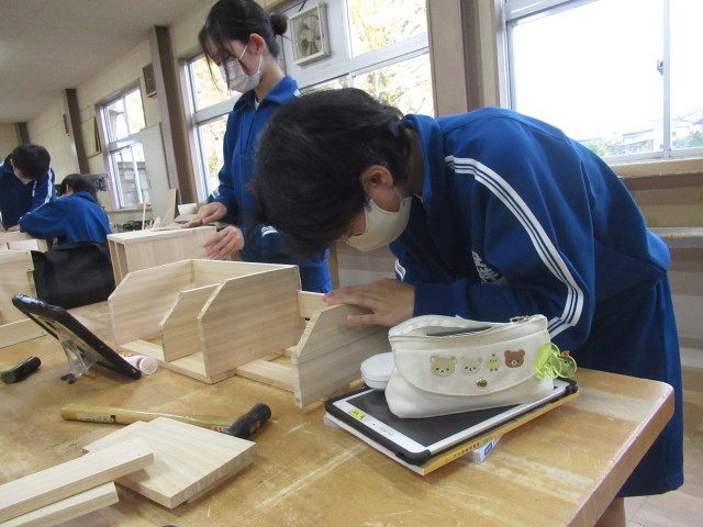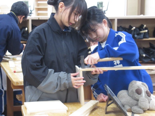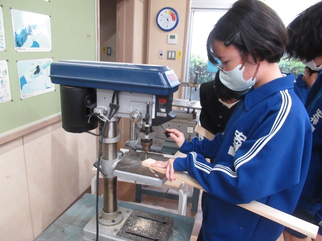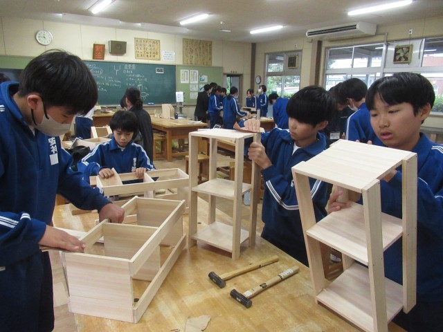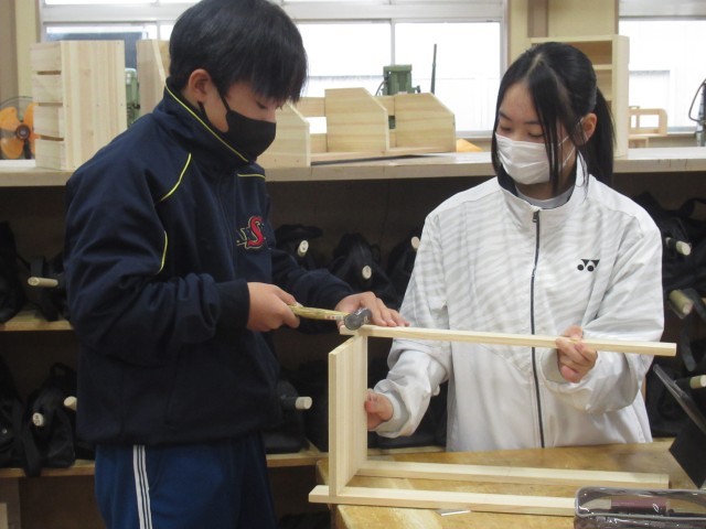 釘打ち用の穴をドリルで空けたり、支え合って釘打ちをしたり、サンドペーパーで仕上げに入ったり、木材加工もいよいよ佳境を迎えました。初めての製作、苦労話もたくさんあるでしょうね。家でのお披露目の時に、たっぷり話してくださいね。