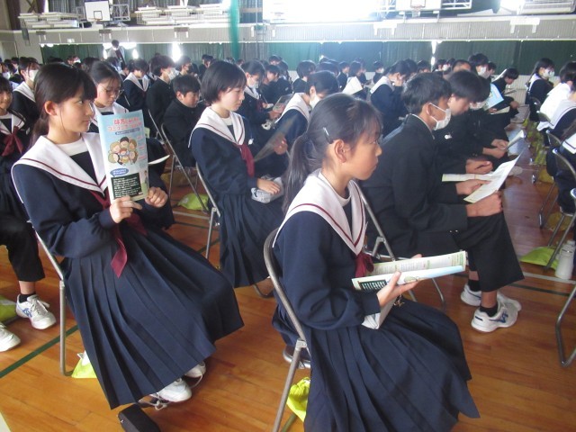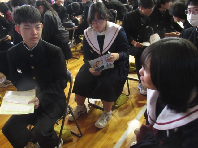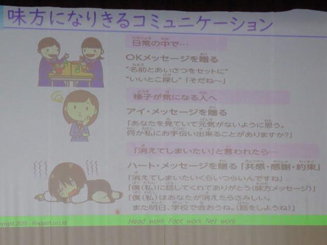 「ドンマイ、がんばって」心が元気なときは、この言葉は励ましになります。でも、心がとても弱っているときは…。そんな時でも味方になりきるコミュニケーションについて、1年生、3年生それぞれが、日本ゲートキーパー協会より講師の先生を招いて、学ぶ機会を得ました。大好きな、そして大切な友達が自分を見失ってしまうほど心がとても弱っているとき、どんな手を差し伸べることができるのでしょうか? 普段のあいさつからのOKメッセージ、そして「ぼくでよければ話を聴かせて…。」のアイメッセージ、明日への一歩を踏み出す「共感」「感謝」「約束」のハートメッセージを学び、誰もがいつの間にかやさしさにあふれたメッセージをつくりあげていきました。今日学んだことを広げていってくれるとうれしいです。