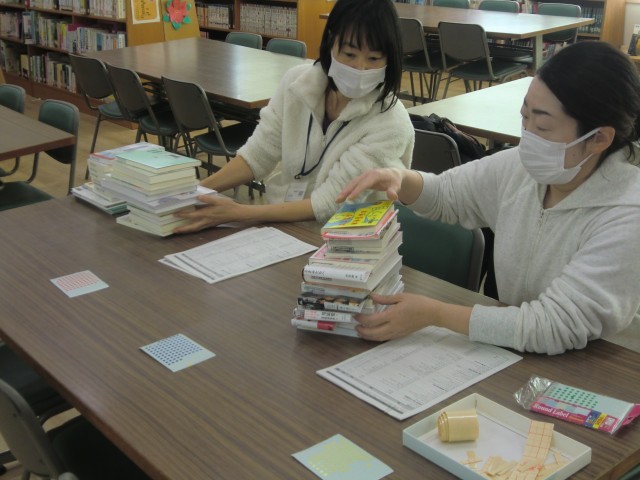 教科書で紹介されている本の仕分け作業(図書館ボランティア)