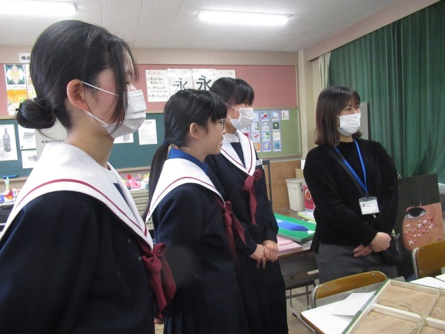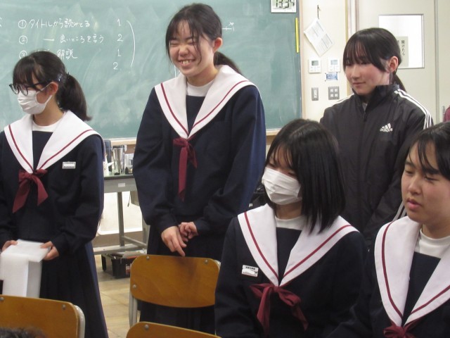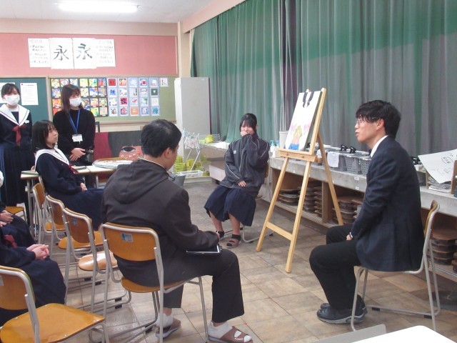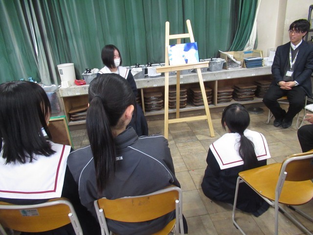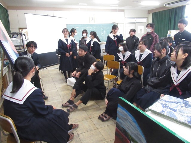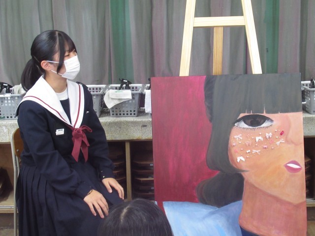 作品のタイトルを聞いた後は、まずはじっくり作品鑑賞、そして、批評、作者による解説、顧問による講評へと続きます。9月の祥美展へ出品した「愛」をテーマにした作品群の作品講評会を美術部では行っていました。自分の思いを受けとめてもらったり、込められた思いに感嘆の声がもれたりしてとてもすてきな会でした。顧問の講評では、作品のよさだけでなく成長した姿についても触れられていて、大作を描き切った喜びをさらに大きくしていました。これで3年生は卒部となりますが、これからも表現活動を続けてくださいね。