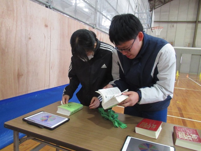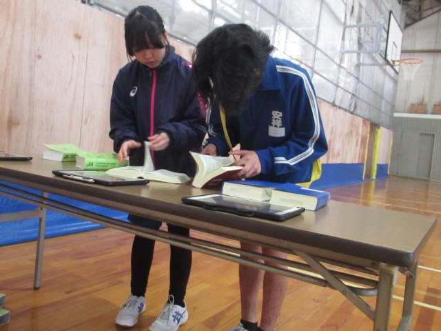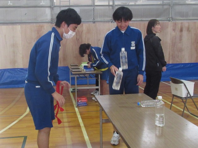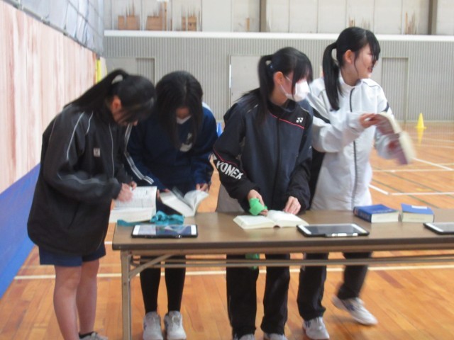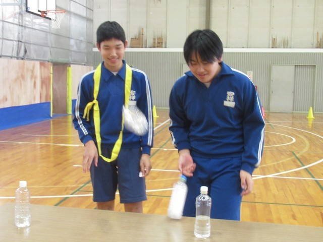 体育館に近づくと、キャーキャーワイワイの歓声が響いてきました。計画委員会の企画で、「借り人障害物競争」に楽しむ3年生です。がっちり手をつないで走るペア、協力して辞書引きやペットボトルフリップに挑戦するペアなど、さまざなでした。明日は、実力テストが控えていますが、つかの間の息抜きになったのではないでしょうか?