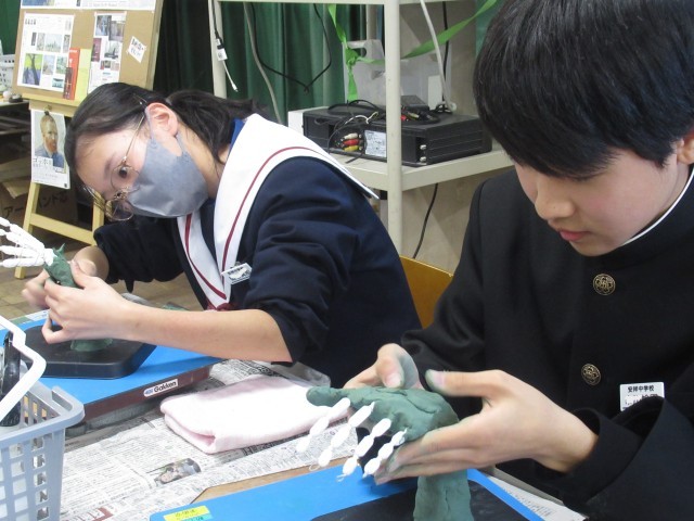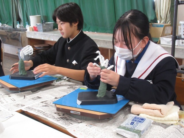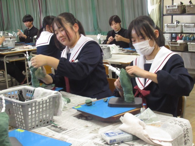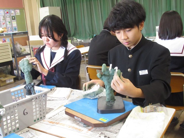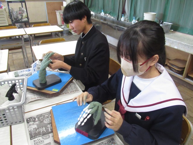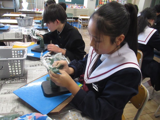 何度もスケッチを重ねた上で、考えた抜いたポージング。今日は無心に荒付けを行っていました。回転盤の上で回転させたり、首をかしげて色々な方向から見つめたりしながら、硬い粘土をつけていきます。無心になって粘土と語っている様子がいいですね。