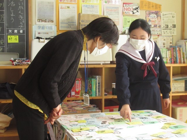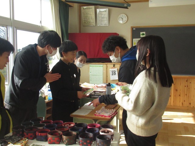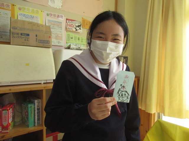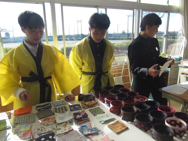 「失礼しま~す。今から販売会を行いますので、先生方どうぞ来てください。」安祥フェスタの際には、残念ながら購入できなかった私たち相手に、特別に販売会を行ってくれました。ありがとう。作業の時間に製作したポチ袋、コースター、巾着袋、しおりなどの販売です。ポチ袋には、馬や亀、鯛などの手作りのスタンプが押してあります。一つ一つの品物について説明付きの販売についつい財布のひもが緩んでしまいました。