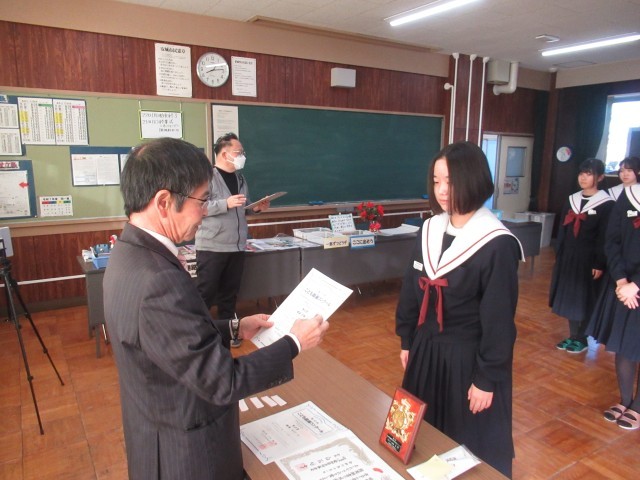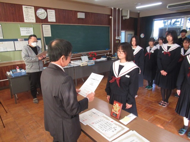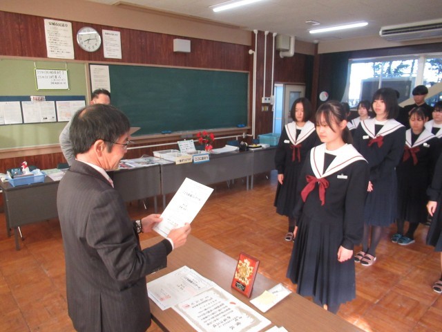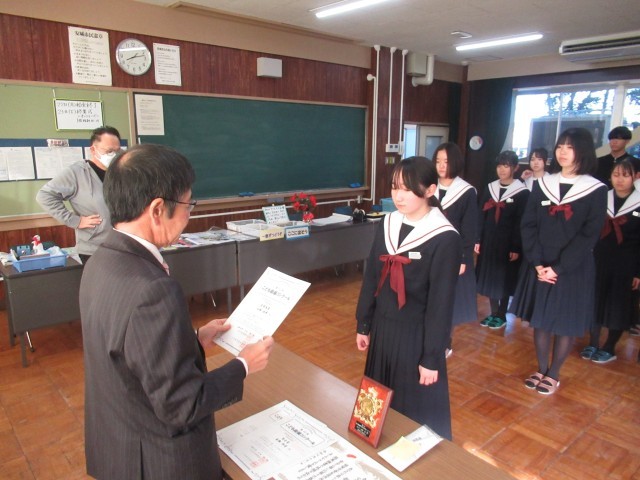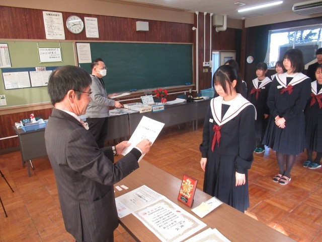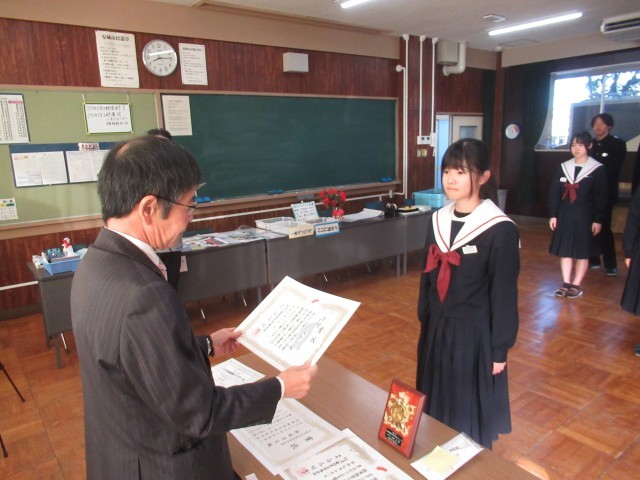 美術部部員たちが応募した「子ども絵画コンクール」や「赤い羽根協賛ポスター」の伝達を行いました。おめでとうございます。