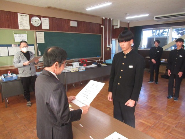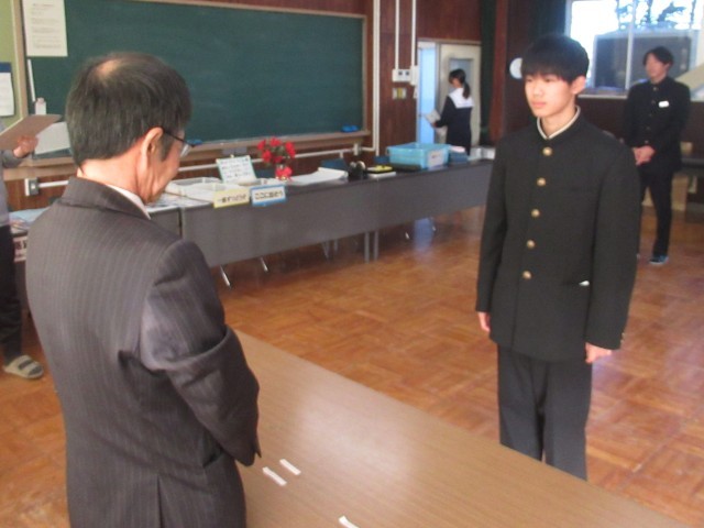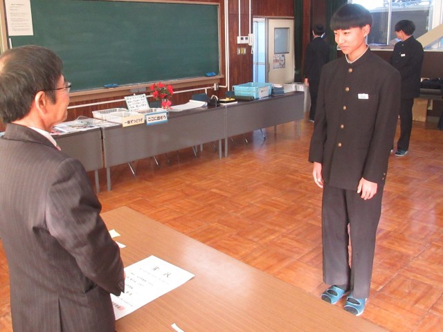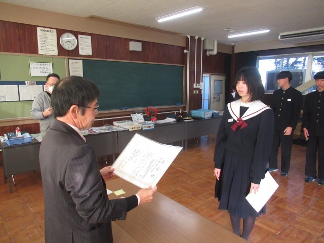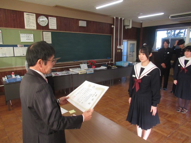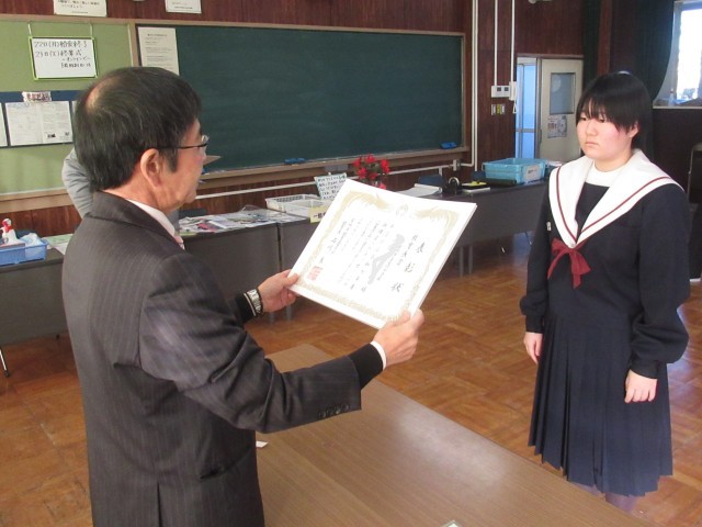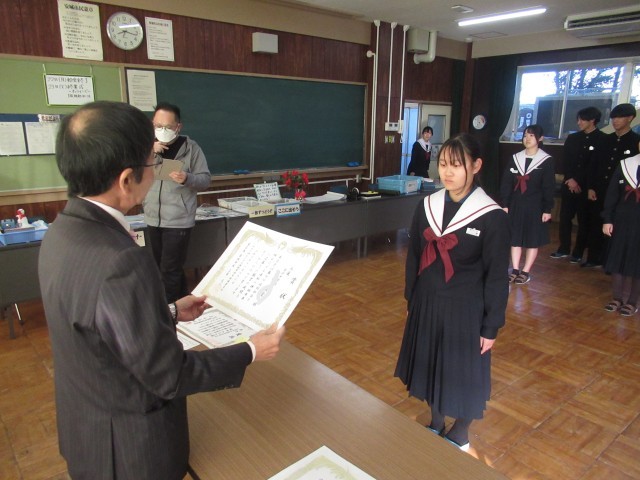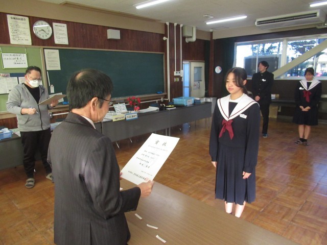 続いて、人権標語コンクール、給食センターの調理員さんへのメッセージ、県新人陸上大会入賞選手・出場選手、ジュニアオリンピック出場選手の表彰伝達、紹介を行いました。2学期では伝達しきれずに、3学期早々に「表彰の会」を実施いたします。快挙にうれしい悲鳴の2学期でした。おめでとうございます。
