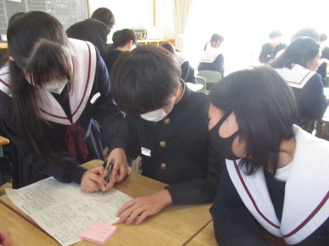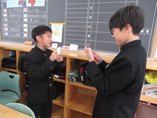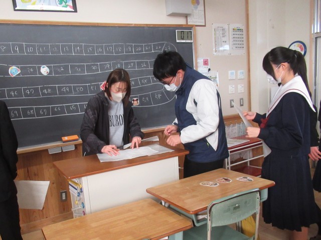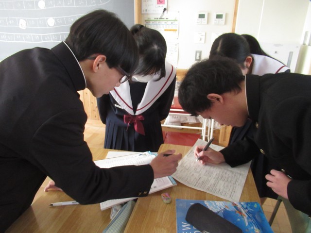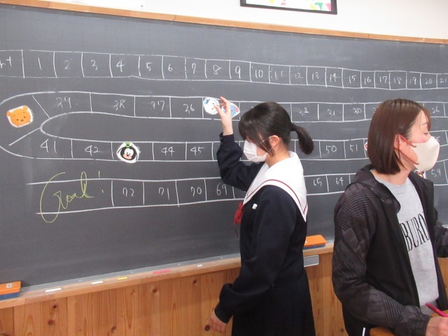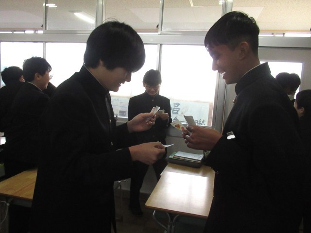 階段や廊下まで響くにぎやかな声に誘われて覗いてみると、二人組のカード取りやグループ対抗双六で大盛り上がりです。とは言え、授業中です。ちゃんと、英語科の学習の一コマだったので、安心しました!!
