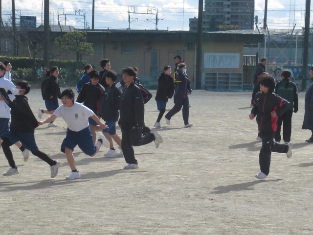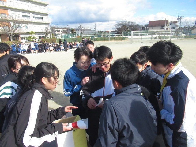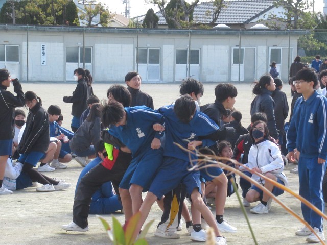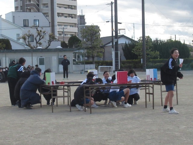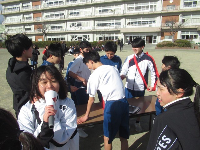 「寒い」を吹き飛ばし、安祥名物砂嵐の中、三学期の幕開けを告げる団対抗レクリエーション開催!! 今回は、全校での人借り競争を行いました。執行部の皆さん、ゲーム説明の動画作成や会場準備、ありがとうございました。寒いからこそ、いつも以上に盛り上がって、熱気充満、そんな1時間となりました。