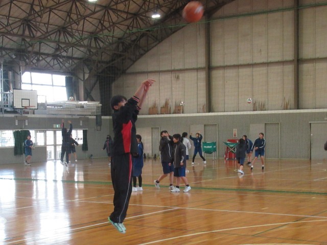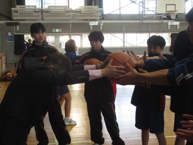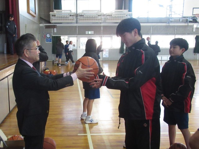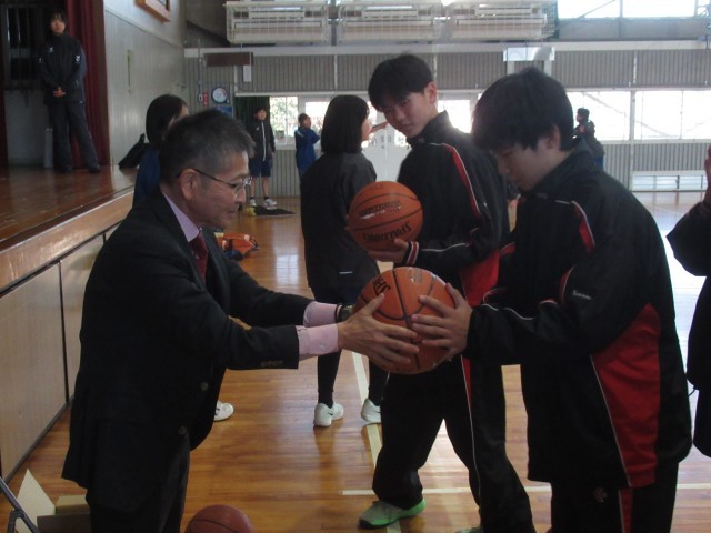 「バスケ男子にプレゼントが届いているよ。」「えー、何ですか?」「『シーホース三河』からバスケットボールが三球も贈られてきました。」「おー」ということで、急遽、贈呈式を行いました。そして、早速、シュートを…。ラスト一球、見事に決まりました!! ますます練習に力が入りますね。