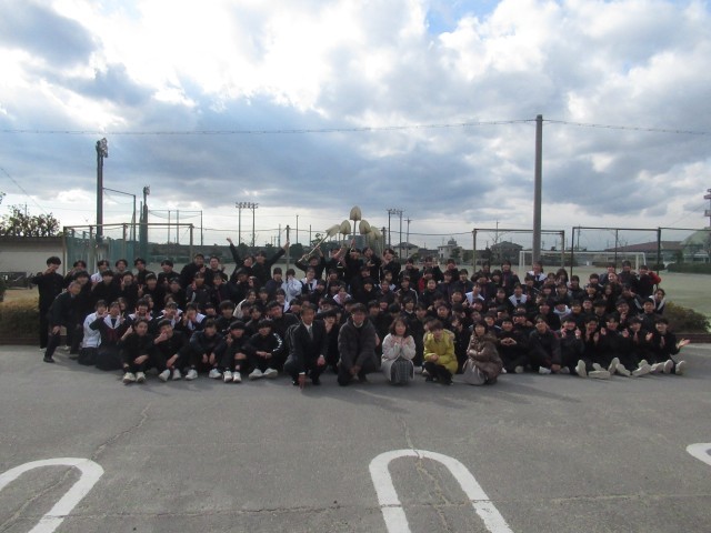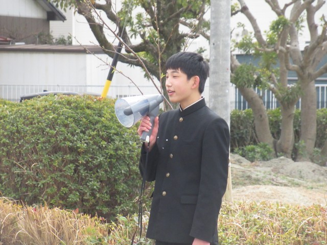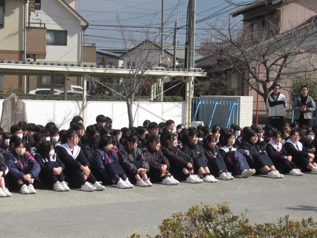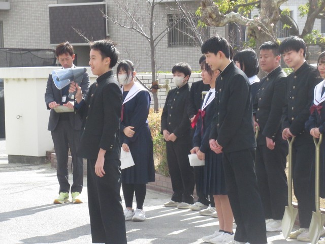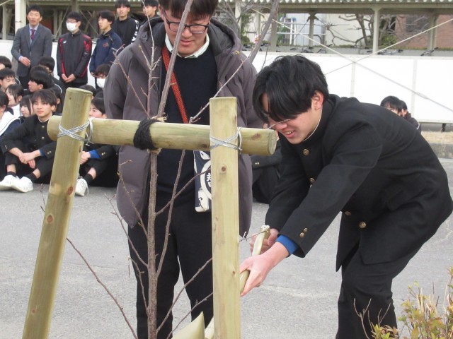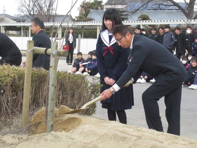 卒業式を華やかにしてくれる正門の河津桜は、30年前から続く今井浜民宿での修学旅行の縁で植えられたものです。人と人とのぬくもりを感じさせてくれる安祥中ならではの修学旅行でお世話になっている河津町と民宿組合から河津桜の苗木を開校45周年のお祝いにいただきました。ありがとうございます。給食での会食で民宿の方と懐かしい話に花を咲かせたあと、植樹式を行いました。心と心の紡ぎ合いを大切にする安祥中の宝物としてこれからも大切にしていきます。