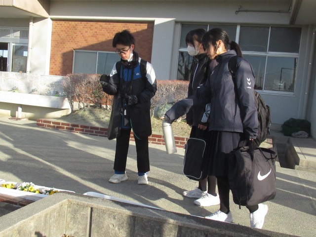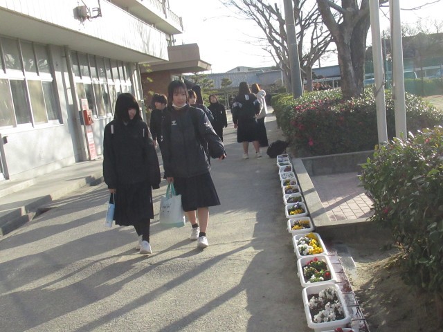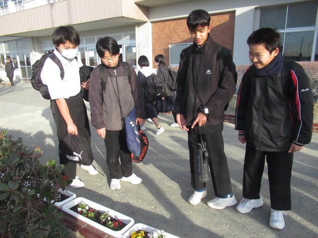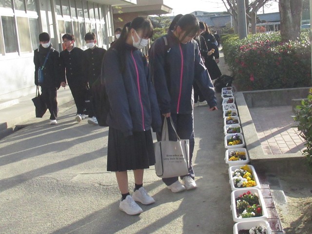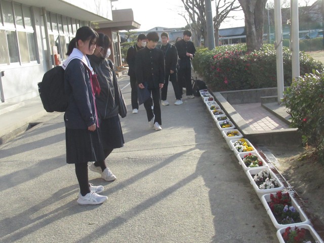 「このプランターがすっごくきれい!」「えっ、こっちだって」そんな声が飛び交う朝です。緑化委員会企画『目指せ1位 全校クラス対抗プランター対決』の審査が行われています。約2か月半、学級ごとに育ててきたビオラのコンクールです。水をやりはもちろんのこと、愛情たっぷりに声掛けをしてきたビオラたち、卒業式や入学式にまさしく花を添えてくれますね。