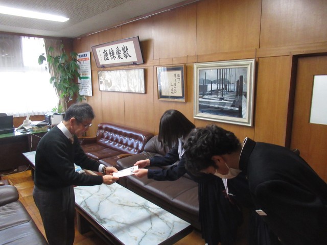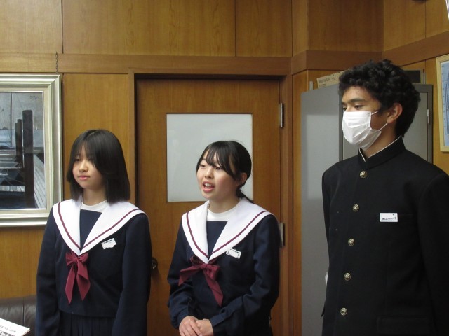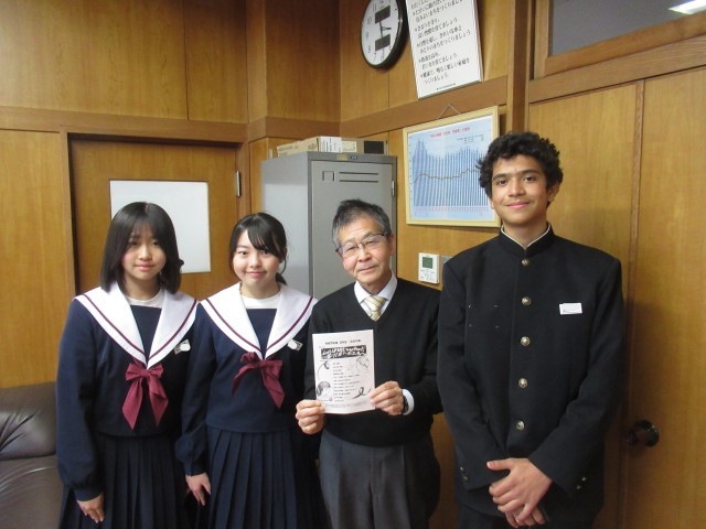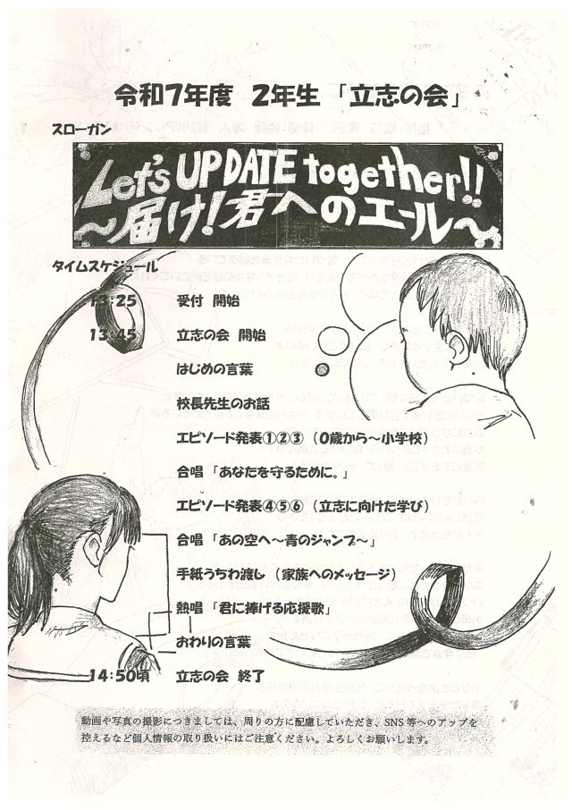 「校長先生、明日は私たちの『立志の会』を見に来てください。」と実行委員長3名(ちなみに副委員長は2名います。やる気がすごいねぇー)がうれしい招待をしに校長室へ。「スローガンに込められた意味は?」「…」「見どころは?」「…」「会を通して伝えたいことは?」「…」全て元気よく即答してくれました。「…」の部分は、明日、午後から大公開です。お・た・の・し・み!!