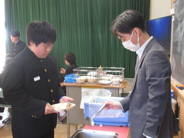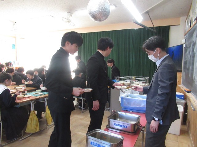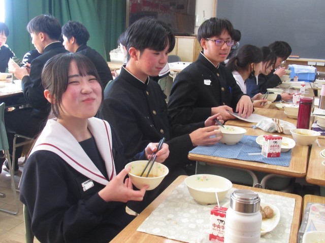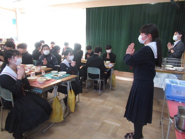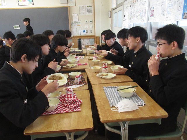 給食は、黙々と前を向いて食べる 皿にあたる箸の音だけが聞こえる これが中学校に入学する前の君たちの姿でした。コロナ禍で、日常が一変してしまいました。そして、令和5年5月8日にコロナの規制が解除され、少しずつ会食の形が戻っていきました。それとともに、「おいしいね。」「うん。」「これ、苦手なんだよ。」「つくねジャンケンやるよ。」「昨日、こんなことがあってさあ。」会話が飛び交うようになりました。この風景が、より「おいしい給食」を生み出していったのではないでしょうか。9年間の感謝を込めて「ごちそうさま」