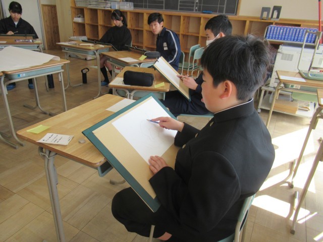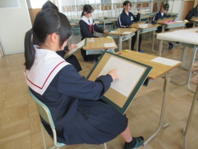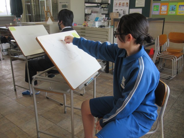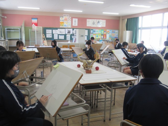美を追究する者同士が集って、初の試みである「合同デッサンコンクール」を行いました。本校と安城南中学校美術部員が一同に会し、デッサンについて学び、スキルアップを図りました。初めての出会いということもあり、少し緊張気味でしたが、やはり同じ道を歩む者たち、互いのよさを自分の作品に生かそうとする雰囲気も次第に生まれ、濃密な時間を過ごしていました。