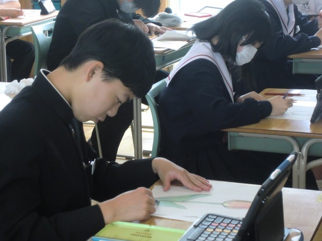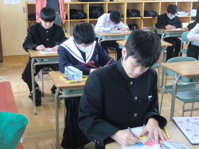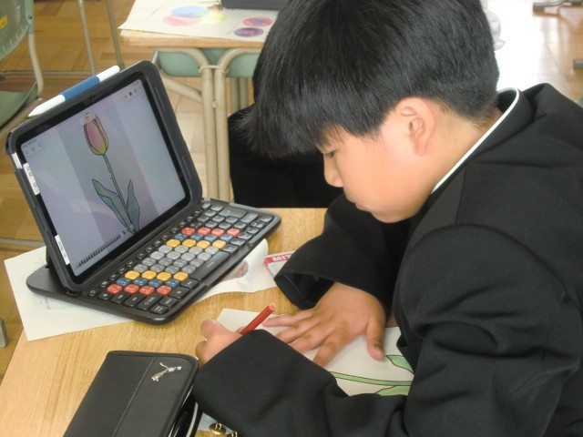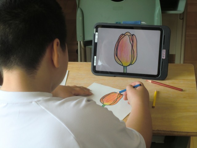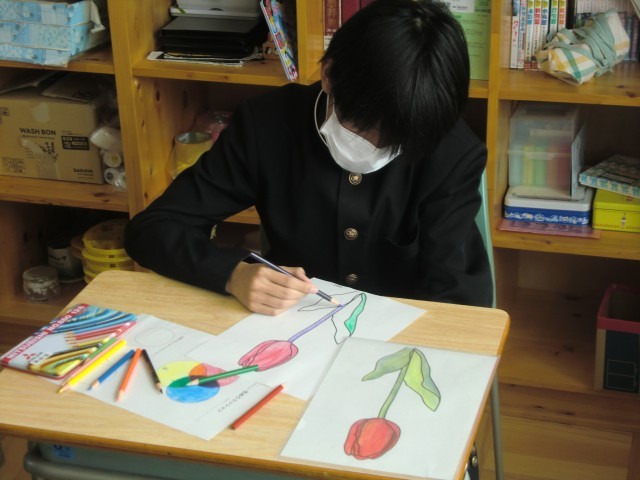三原色(赤、青、黄)の色鉛筆のみで、チューリップに色付けをしました。先生の手本を参考に、色を重ねたり、濃淡をつけたりして、きれいなチューリップを完成させました。画像を拡大して細部までよく観察する人、先生の実際の絵と比べる人、自分の感性を信じてぬり進める人、それぞれの個性がよく出ていました。ともあれ、この時のみんなの集中力、すごかったなあ。