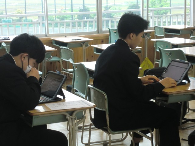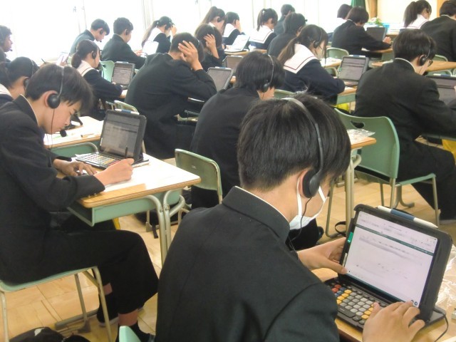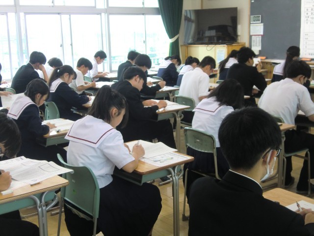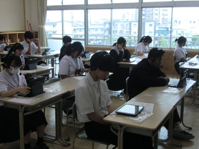 3年生が午前中、国語・数学は記述式で、英語(読むこと、書くこと)はヘッドセットとタブレットを駆使して調査に取り組みました。ヘッドセットを頭につけ、タブレットに向かってテストを受けている姿に、時代の流れを感じました。3年生の皆さん、これまでの学習の成果は発揮できましたか?