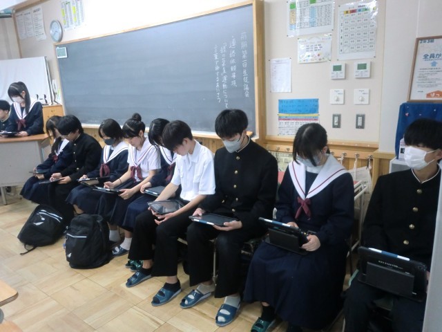 本日の授業後、生徒会執行部、委員長、級長が参加し、生徒議会が行われました。本日は第1回ということもあり、連絡依頼事項のみでしたが、今後は、よりよい学校、よりよい学校生活になるような話し合いが行われていくことでしょう。1年生は初めての議会でしたが、3年生が優しく説明をしていました。ありがとう、3年生。1年生は昨年度まで学校を引っ張る立場でした。その力を中学校でもまた発揮してほしいと思います。