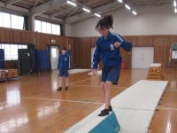 マットや跳び箱、平均台を次々と跳び越えたり、回転したりしていきます。開脚跳び、閉...
