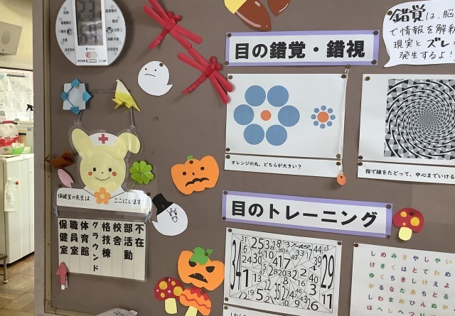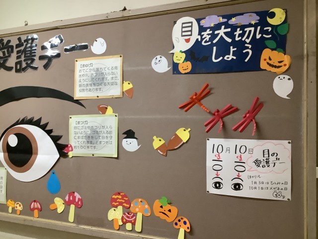 10月10日は「目の愛護デー」ということで、保健室前の掲示板には、目に関する情報とともに、保健室の先生からの「目を大切にしよう」というメッセージ。