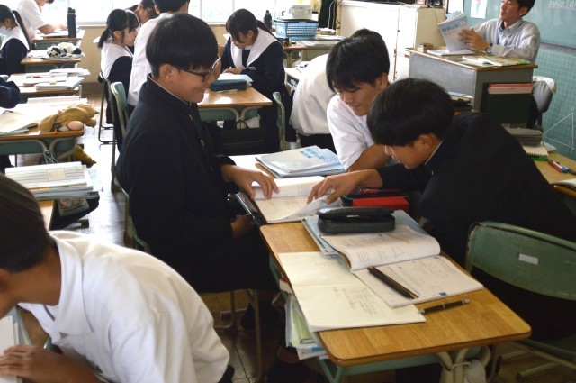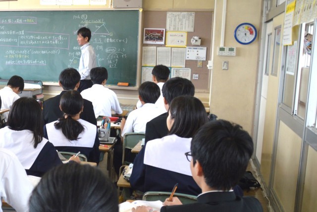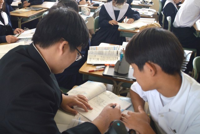 3年生の数学は、「図形と相似」を学んでいました。授業の後半の問題集を解く時間には、友達と教え合う姿あり、黙々と問題に向かう姿ありと、それぞれに解き進めていました。真剣に集中して取り組む姿は、さすが3年生です。