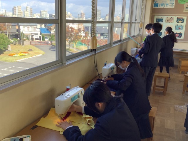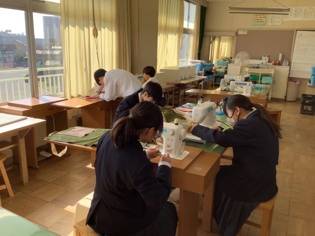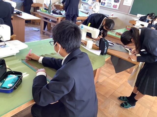 1年生の家庭科では、トートバックを作っています。ミシン縫いがまっすぐに縫えるように、みんな丁寧に集中して取り組んでいました。それぞれに好みの色の布を選んで製作していて、お気に入りの作品ができそうです。