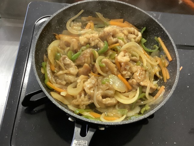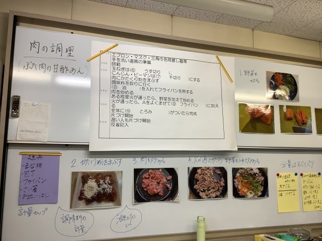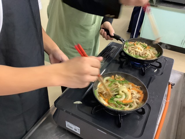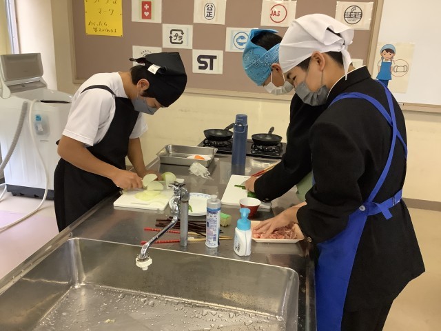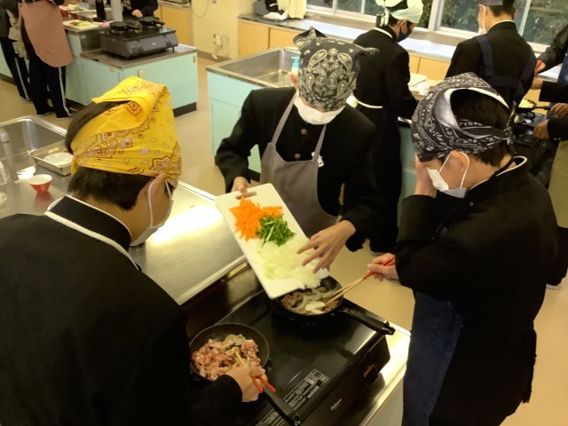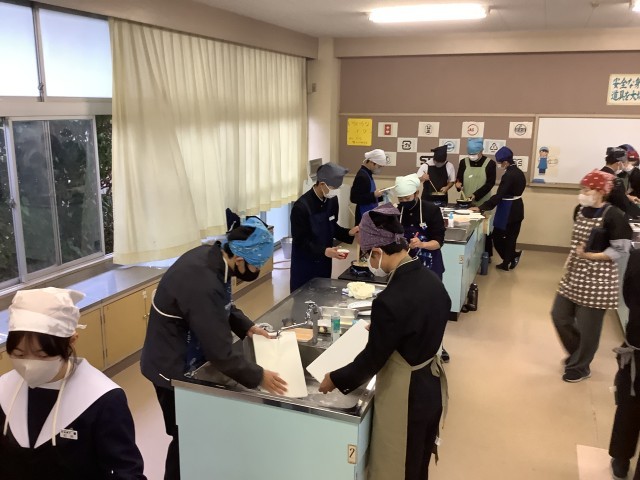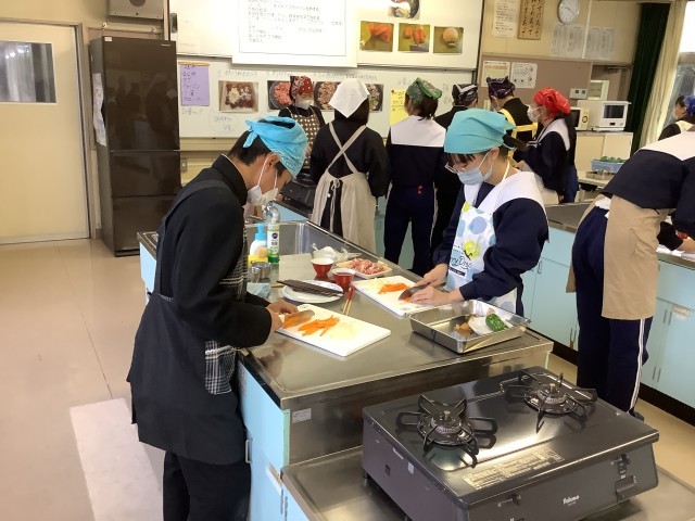 調理室では、「ぶた肉の甘酢あん」の調理実習をしていました。先生の説明をよく聞いて、手際よく野菜を切り、肉にしっかりと火が通るように気をつけて調理していました。あつあつのおいしいうちに食べようと、班で協力して準備や片付けも行いました。どの班もおいしそうな完成品をもりもりと食べていました。