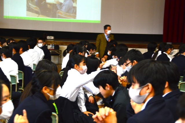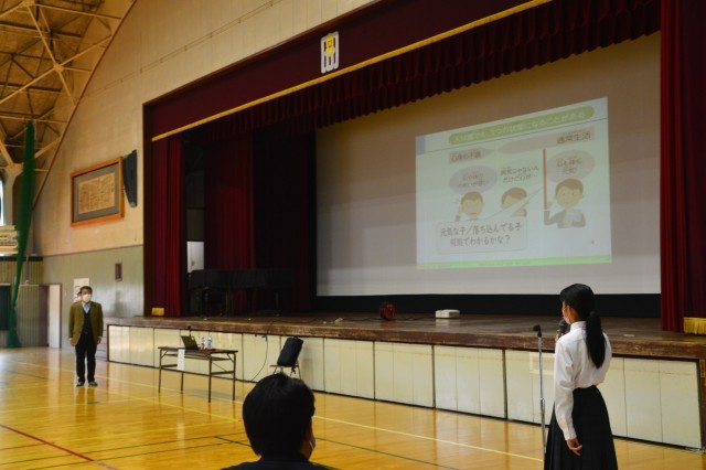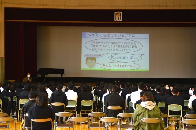 第2回の学校保健委員会。NPО日本ゲートキーパー協会理事長 大小原先生をお招きして、「みんなだいじ♡プロジェクト~味方になりきるコミュニケーション講座~」を行いました。1年生の生徒と拝聴を希望する保護者が参加をして、「心が弱っている友達から相談されたら、どんな言葉をかければよいか」と、たくさん考え、話し合って、味方になりきるコミュニケーションについて学びました。参加した1年生の生徒たちは、活発に話し合ったり、挙手したりして意欲的に参加する姿がすてきでした。