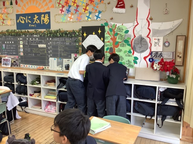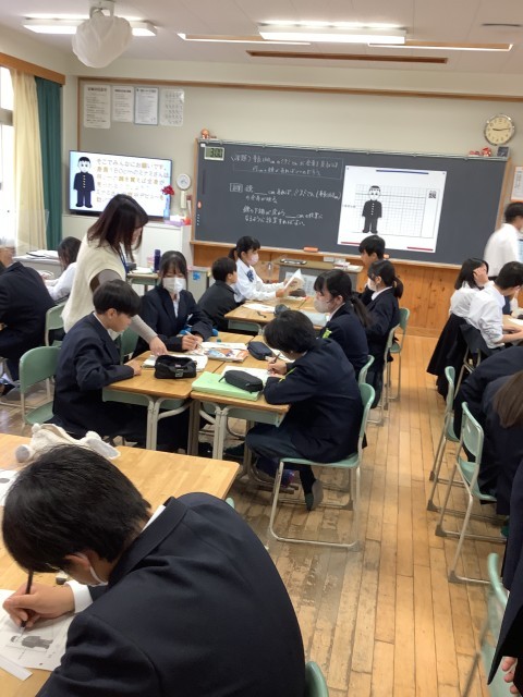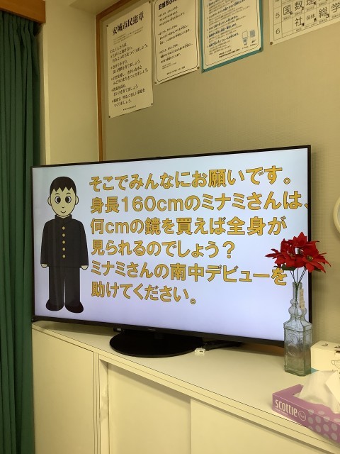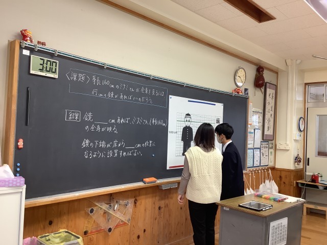 1年生の理科は、光の学習。今日の学習課題は、「身長160㎝メートルのミナミさんが全身を見るには、何㎝の鏡があればいいのだろう。」でした。教室のあちこちに置かれたヒントカードをもとに、グループで相談しながら光の作図をして、課題の答えを見つけていました。仲間と知恵を出し合って粘り強く課題に向かう姿や、答えにたどり着き喜び合う姿がありました。