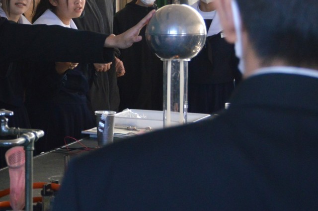 理科室からザワザワザワと生徒の声が聞こえるのでのぞいてみると、静電気の実験をしていました。