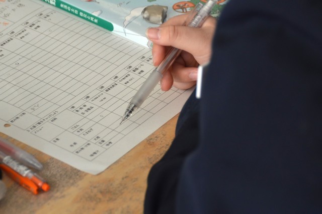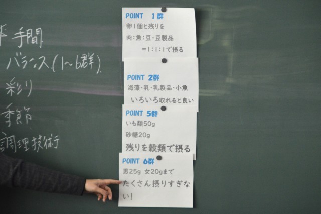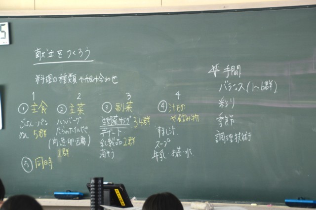 「先生、この献立はどうですか?」とアドバイスを受けながら、バランスのとれた献立を考えることができたようです。それぞれにじっくりと考えてオリジナル献立作りをしたので、授業の終わりには、どのようなことに気をつけたのか、自分のこだわりポイントを振り返りに記すことができていました。