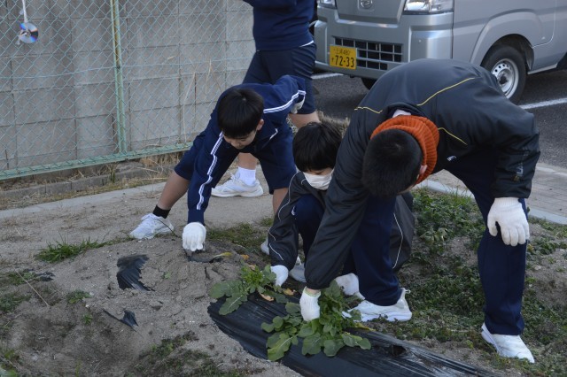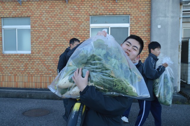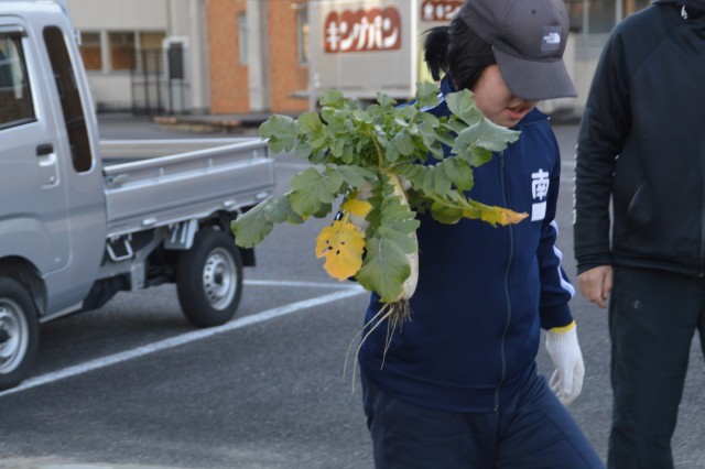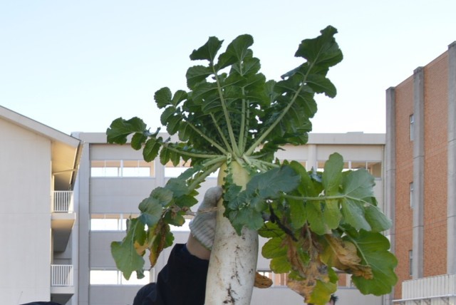 今日は畑でとれた大根の収穫です。大きくて立派な大根から、小さくて柔らかそうな大根までたくさんとれました。収穫の後は、とれたての大根を職員室で販売しました。大きな大根は、おでんがおすすめだそうです。今後、家庭科の授業では、ポトフをみんなで作る予定です。