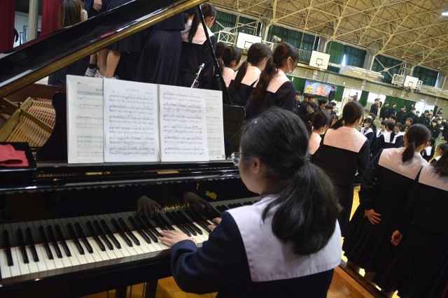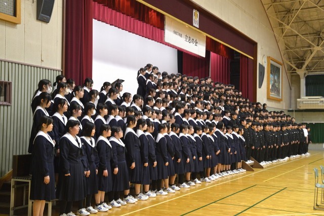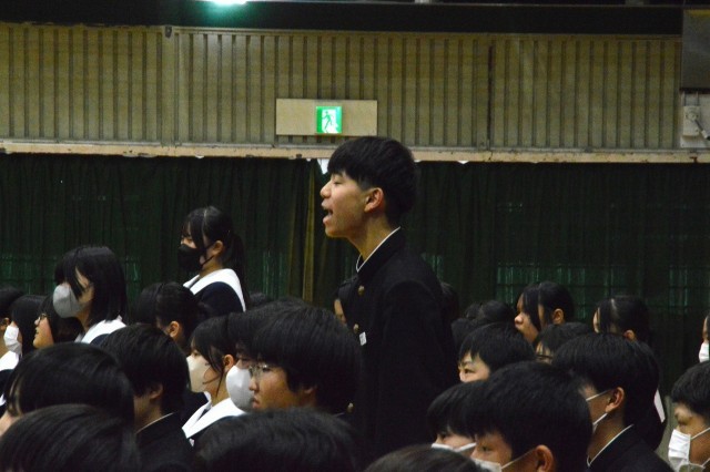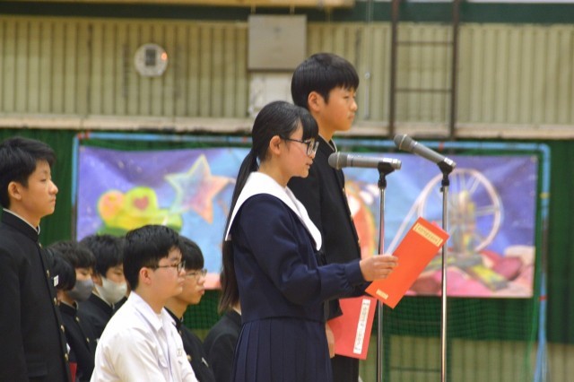 教室では、各学級毎に「一人一宣言」、体育館では学年全体で、「学びの足跡」を映像でふりかえり、「群読」「合唱」「代表生徒の宣言」などで、決意を表明しました。自分らしい生き方を求め、未来に向けて一歩を踏み出すための立派な節目の会になりました。
