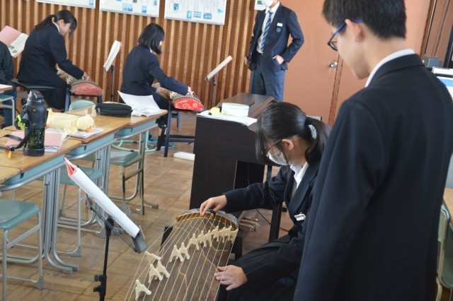 本年度最後の音楽の授業は、日本の伝統楽器である琴で「さくら さくら」の合奏でした。力強く弦を弾いて美しい音色を奏でていました。