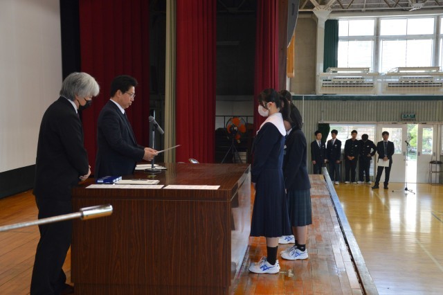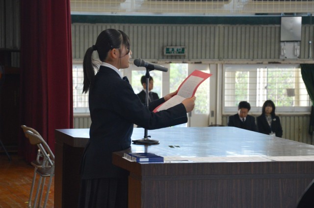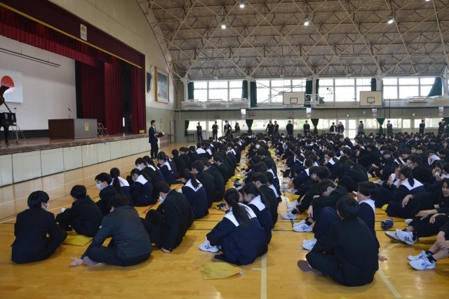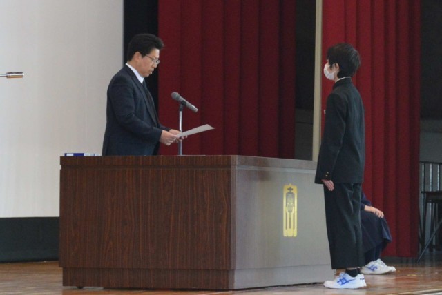 温かな晴天の本日、1・2年生修了式が行われ、校長先生より修了証が手渡されました。1年生代表の生徒の話は、この1年の成長が語られ、その成長を支えてくれた周りの人への感謝の思いで結ばれました。式後、生徒指導からの話では、これまで校長先生から繰り返し語られた「いのちの大切さ」について全校生徒に投げかけられました。先日話題となった、妊婦さんを駅で救った本校卒業生の記事を取り上げながら全校生徒が「いのち」について考え、思いを語りました。校庭の桜が温かく見守っていました。