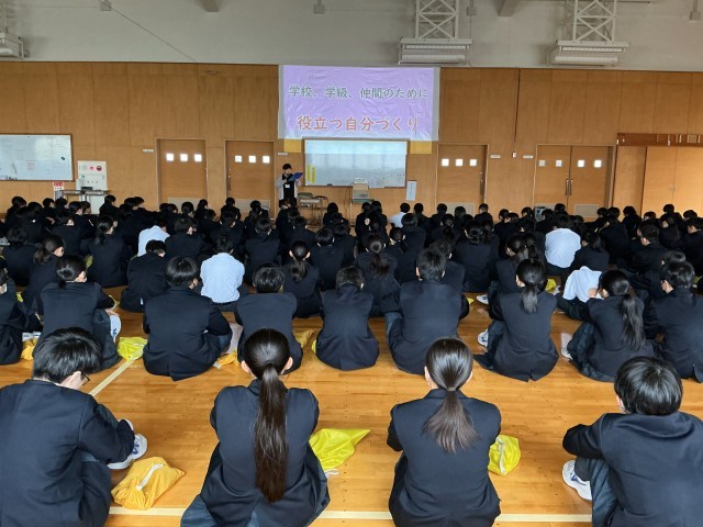 先生方のおもしろい自己紹介、学習、職場体験、部活動、生活についての話がありました。