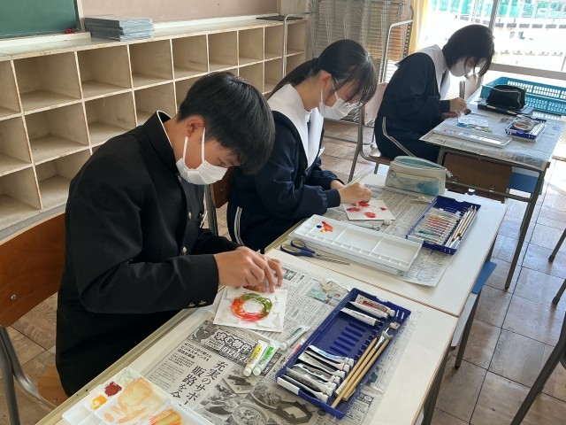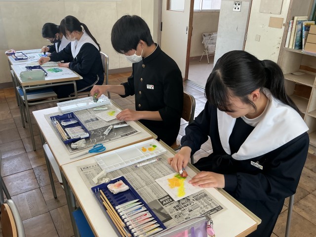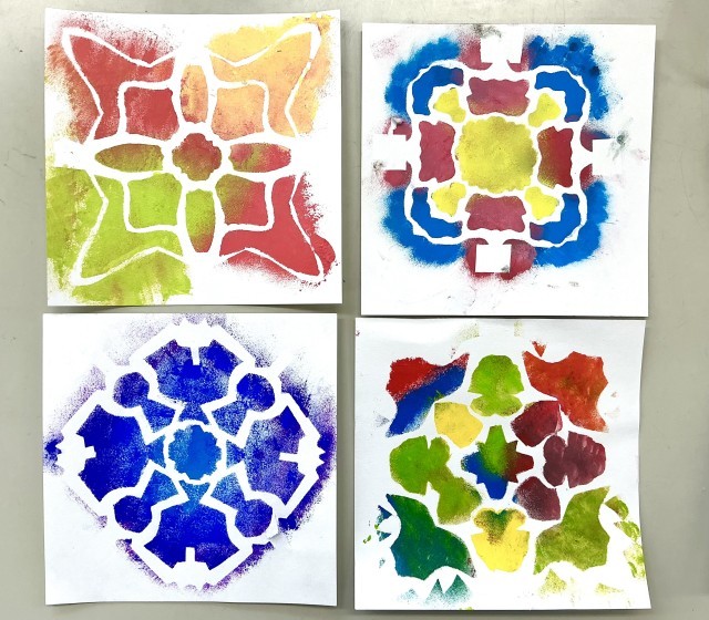 授業がスタートしました。美術の授業ではステンシルを行いました。版の穴の形を工夫したり、グラデーションをつくるにはどんな色の組み合わせが良いか真剣に考えたりして、取り組みました。