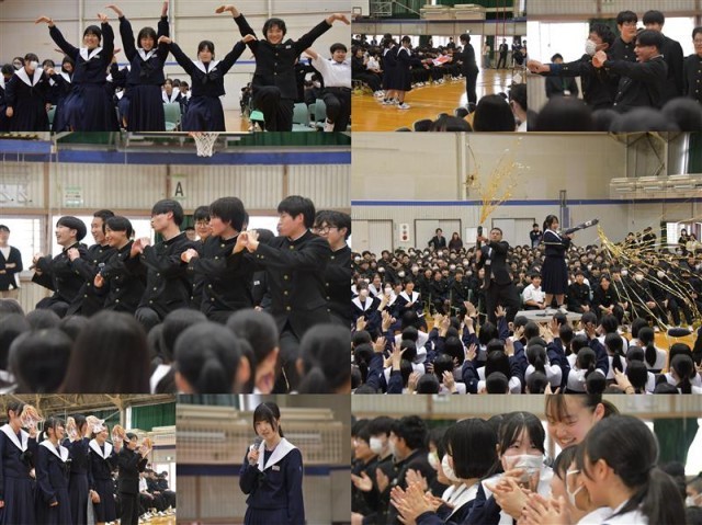 大好きな3年生の卒業を笑顔で祝いたいという後輩からの温かい気持ちが、全校参加型のクイズや団の先輩へのエールなど、どの企画にも盛り込まれていて、自然と北中全体で盛り上がり、笑いが起こっていました。楽しい反面で、卒業を惜しむ気持ちがつのり、涙をこらえる後輩の姿もありました。次は何が始まるんだろうとわくわくしながら楽しんでいる3年生の姿も印象的でした。