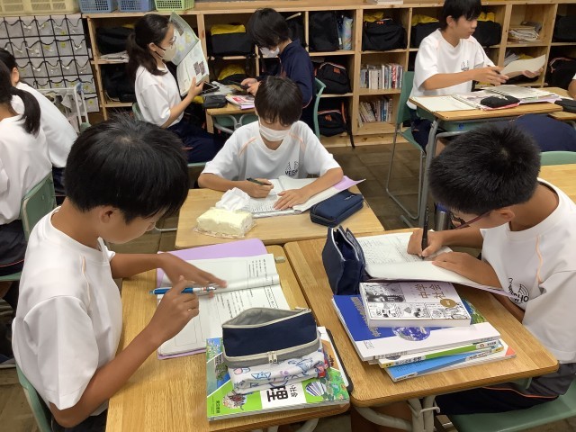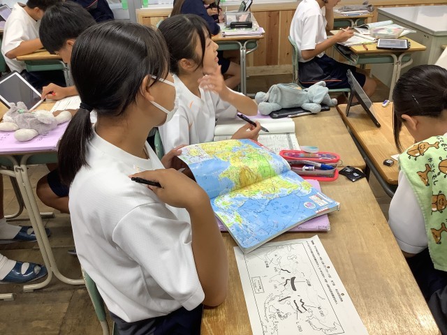 教科書を読む生徒、地図帳を広げる生徒、タブレットで調べる生徒がいます。