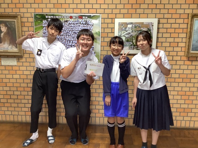 前期生活委員会の取り組みとして、明和小学校へ出向き、小学生へのあいさつ運動を数回行いました。そのお礼のお手紙を明和小学校代表の子が届けに来てくれたので、委員会代表の生徒が受け取りました。冊子にはたくさんの明和っ子からの温かいお礼の言葉がつづられており、心が温かくなりました。お互いが元気になる、気持ちのこもったあいさつをこれからも明祥中学校から広めていってほしいと願っています。