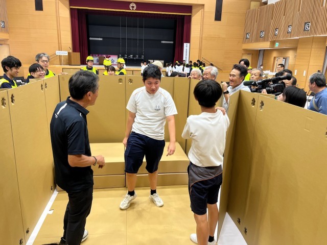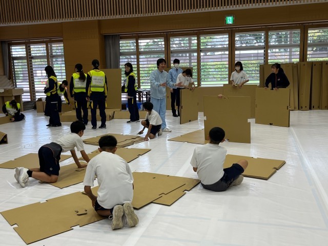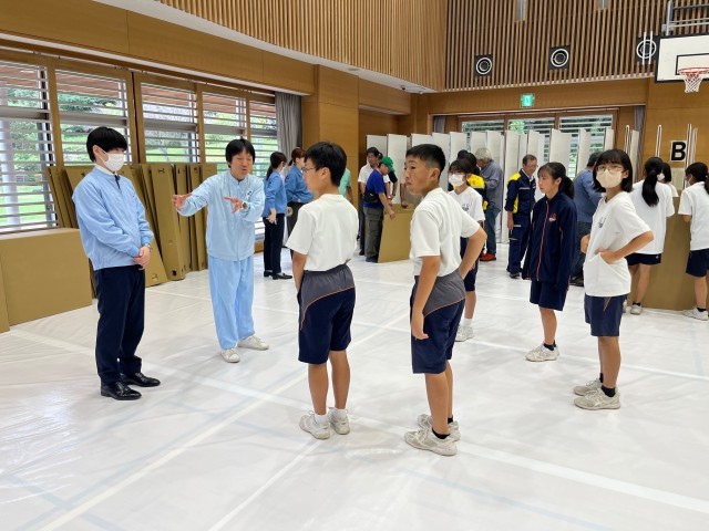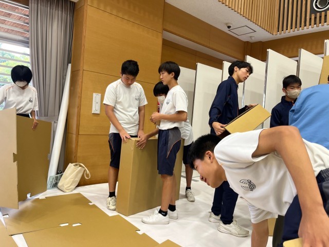 安城市総合防災訓練が明祥プラザで行われ、20名を超えるボランティアの生徒が参加しました。発災の避難所で行うことの講話をいただいた後、段ボールを使ったベッドや床シート、壁、簡易トイレを作成する研修があり、方法を教えていただきながら学ぶことができました。いざというときに大きな力として期待される中学生。貴重な学びの場となりました。