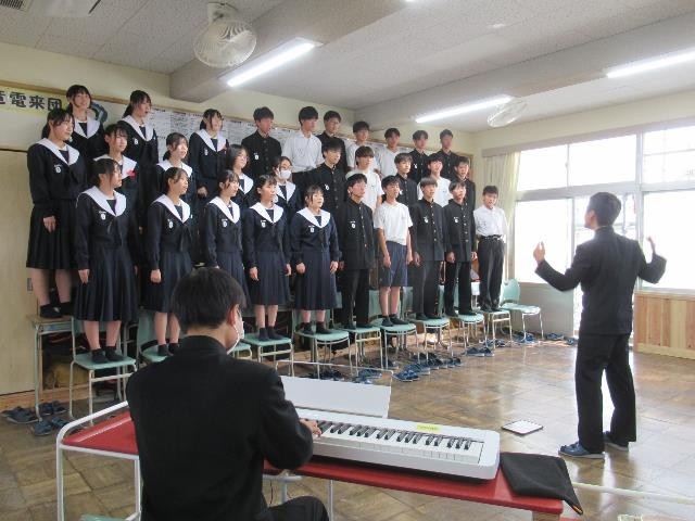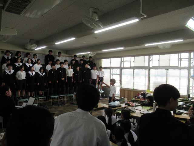 通し練習、他の学級との交流会、楽譜を見て細かいところの確認。