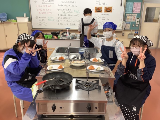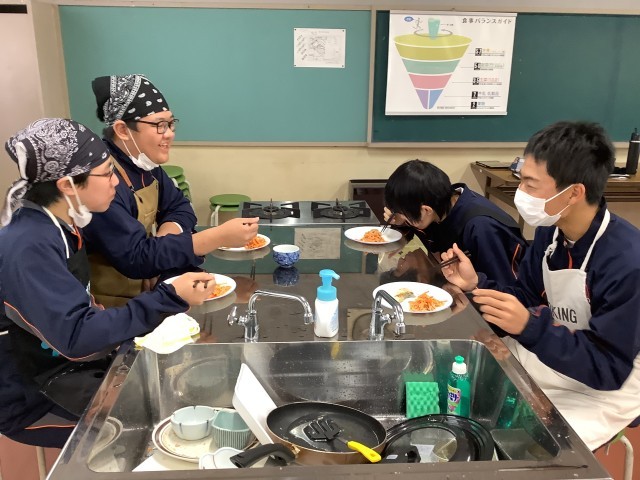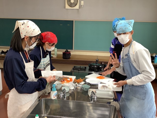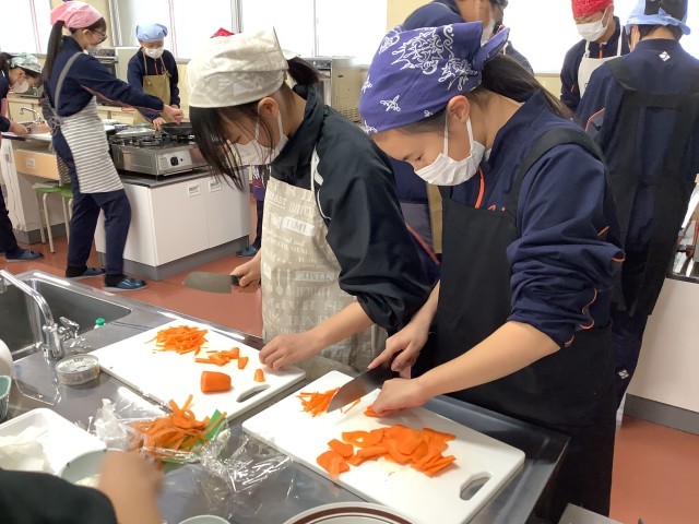 2年生の家庭科では、調理実習を行っています。野菜の千切りやメイン料理の味付けなど、さまざまな料理に挑戦しています。片付けまで手際よくできるようになってきました。